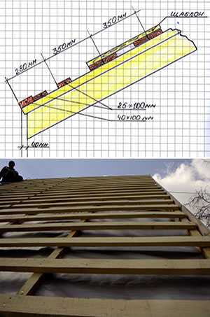- производится монтаж обрешетки под металлочерепицу из досок с применением шаблона для соблюдения одинаковой величины зазора.