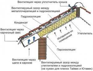 - Классический тип. Требует выполнения двухконтурной вентиляции. То есть – между изоляцией и утеплительным слоем, и между изоляцией и кровельным материалом. Зазор для вентиляции в обоих случаях должен составлять от 30мм до 50мм.