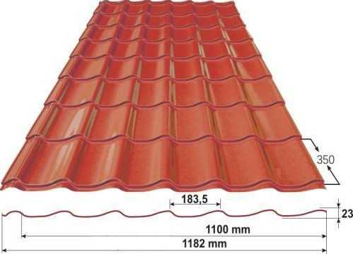 Металлочерепица выпускается в виде больших листов, имитирующих отдельные фрагменты, наложенные друг на друга. Листы имеют полную ширину и полезную.