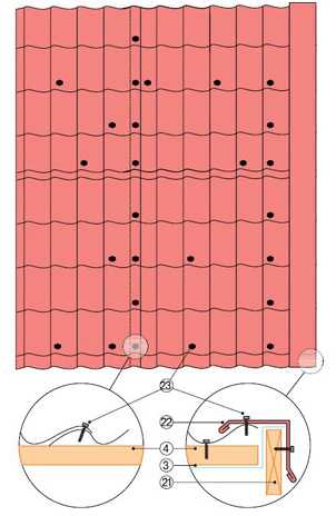 - На квадратный метр листа необходимо 6-8 точек крепления. На краях, по карнизу крыши и у конька крепление делается через волну. По линии нахлеста – под каждым поперченным гребнем рисунка.
