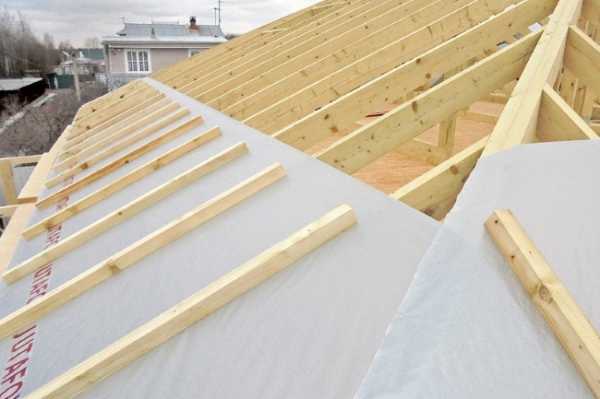 Для этого на стропила набивается промежуточная обрешетка высотой 50 мм. Гидроизоляция временно пристреливается к ней строительным степлером, а затем окончательно крепится рейками контробрешетки. В этом случае в качестве гидроизоляции можно использовать более широкий ассортимент пленок.