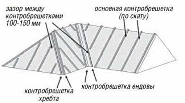 Контробрешётка образует вентилируемое пространство между гидроизоляцией и кровельным покрытием. Её рейки следует ставить со значительным шагом. Между ними получается пустота, заполненная воздухом.