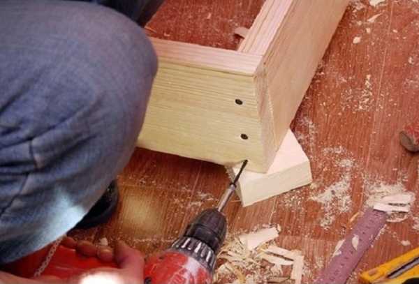 Коробку складывают, выставляют углы 90°. Удерживая стойку и притолоку в таком положении дрелью сверлят отверстия. Если есть помощник, держать может он. Если работаете один, выставленную правильно коробку временно скрепите двумя поперечными брусками — ближе к верху, и внизу. Это поможет не ошибиться и сделать правильное соединение.