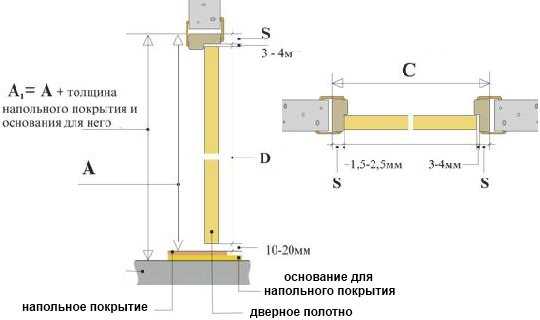 При расчете высоты учтите, что стойки должна быть на 1-2 см длиннее дверного полотна (с учетом спилов). Под дверью делают зазор в 1 см, если под не предполагают класть коврик. Если коврик/ковер/ковролин будет, лучше его сделать больше. Не бойтесь оставлять зазоры. Они необходимы для нормальной вентиляции в помещении. Еще раз обращаем внимание: высота измеряется по внутренней части дверной коробки — от нижнего края до спила. Отрезав, примеряете стойки в дверной проем.