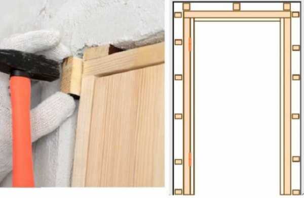 Полотно двери прикладывают к проему и на стене помечают верхнюю границу, от нее отступают кверху еще на 7 см, чертят вторую линию и закрепляют по ней закладную – брус соответствующей длины и толщины.