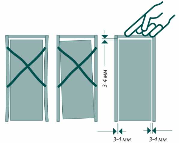 Закрепив две петли, укладывают дверное полотно в собранную коробку, выставляют правильные зазоры: со стороны петель — 5-6 мм, 3 мм с противоположной стороны и сверху. Выставив эти зазоры, полотно фиксируют при помощи клиньев. Выставляют ровно в горизонтальной и вертикальной плоскости (можно использовать подкладки, если это необходимо).