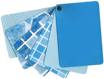 - Пленка ПВХ представлена на рынке в широком ассортименте расцветок – от однотонных до материала, что имитирует декоративное плиточное покрытие, бело-синюю и бело-бежевую мозаику. Как правило, она производится в сине-голубой гамме, но также бывает зеленой, бежевой, бирюзовой и белой.