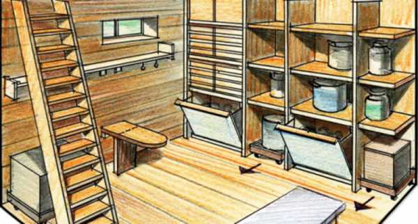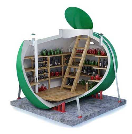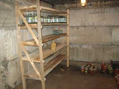 - Внутреннее пространство помещение обставляется полками для овощей, фруктов и домашней консервации.