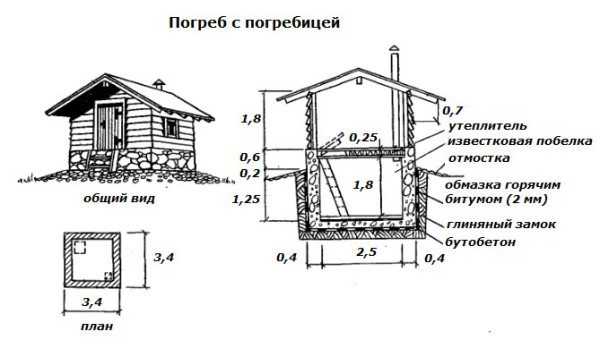 Размер погреба зависит от объема вещей, которые в нем собираются хранить, а форма его может быть как круглой и квадратной, так и многогранной. Погреб состоит из нижней части, уходящей в землю, и погребицы – наземной части, которая защищает его от перегревания летом и зимних морозов. Погребицу делают из дерева, бетона, камней и кирпича или досок с засыпкой. Погребицу можно использовать как обычную кладовку. Над погребом делают перекрытие путем настила досок на укатанные балки, а сверху его покрывают теплоизоляционным материалом.