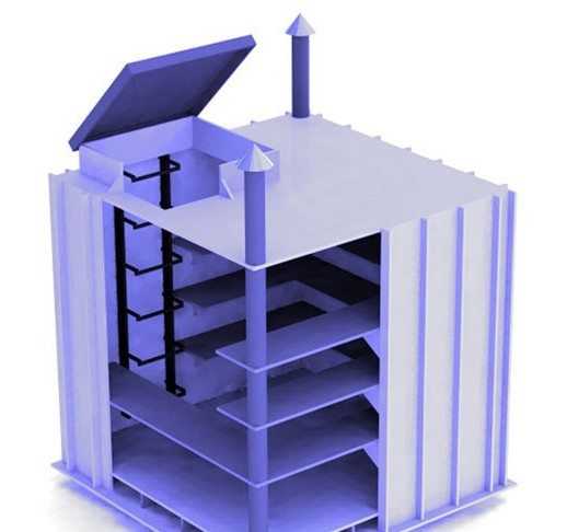 На фото конструкция с ребрами жесткости, оснащенная крышкой, полками, вентиляцией и лестницей.