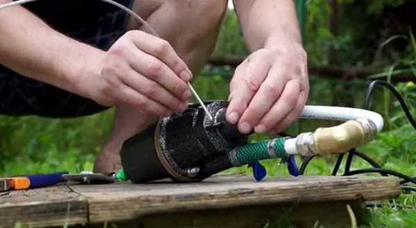 Монтаж насоса потребует от вас определённой сноровки. Чтобы облегчить эту процедуру, необходимо провести небольшую подготовку: при помощи термоусадочной муфты скрепить оба кабеля насоса и связать между собой пищевую трубу и страховочный трос. Чётко рассчитать оптимальную глубину погружения можно сверившись с показателями данной скважины.