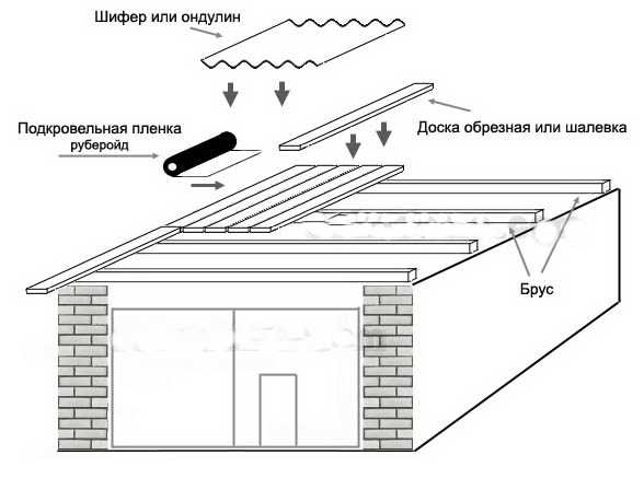 Так как последовательность работ зависит от вида стропильной системы, разберем, как своими руками построить односкатную кровлю для гаража шириной 4,5 м. Так как размеры постройки позволяют, можно обойтись сооружением самого простого типа стропильной системы односкатной крыши:
