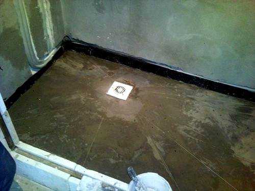 - Уложите гидроизоляцию, предварительно вырезав отверстие под слив. Если вы не будете устанавливать фартук, то просто обработайте специальной грунтовкой поверхность возле трапа для гидроизоляции.