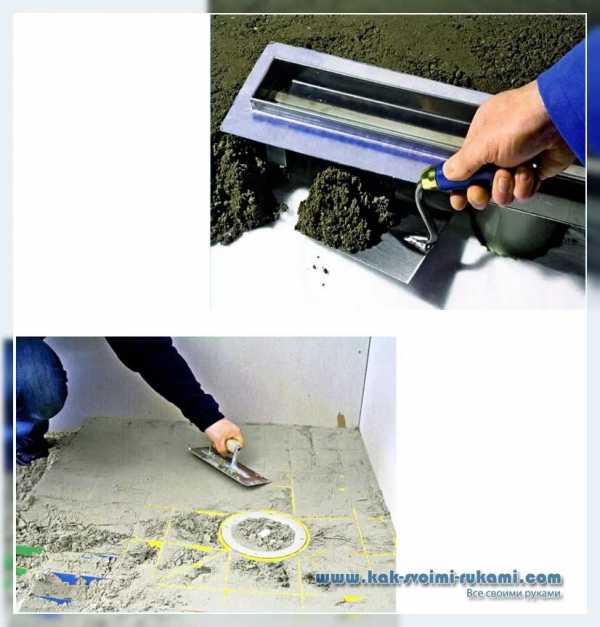 Необходимо распределить бетон так, чтобы он заполнил всё пространство до фланца трапа. Если вы не использовали пенопласт для основы, то необходимо сделать всё то же самое, только на черновой пол.