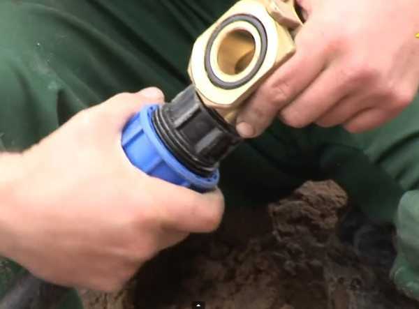 Накручиваем на адаптер компрессионную полиэтиленовую муфту для труб и к другому её концу закрепляем трубу ПНД, которую разворачиваем по траншее до самого дома, только нужно сделать запас для ввода.