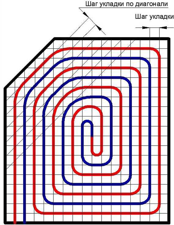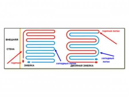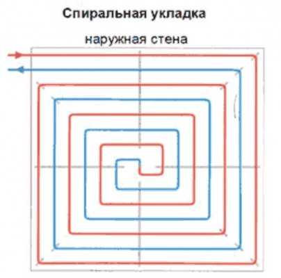 У такого контуру нерівномірний розподіл тепла. Для того щоб це виправити, необхідно монтувати петлі у вигляді подвійної змійки або спіралі. Області поблизу зовнішніх стін будівлі називають граничними зонами. Тут рекомендується зменшувати крок укладання труби, для того щоб компенсувати втрати тепла.