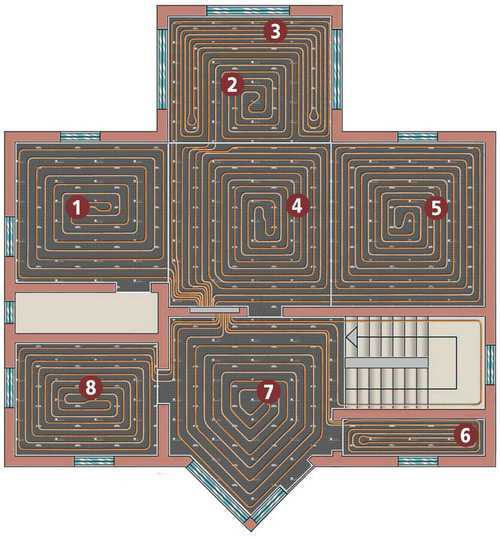 З кроком з’ясували, тепер потрібно відзначити ще один важливий момент, також пов’язаний з відмінністю від теплових теплих підлог. Якщо у випадку з тепловим підлогою джерелом тепла є сам кабель, то труба з водою – лише теплоносій, втрачає тепло з кожним метром. Крім того, тиск у трубі забезпечується насосом, якому також «небайдужа» довжина контуру. Таким чином, для водяної підлоги довжина труби – більш важлива величина, ніж крок укладання.