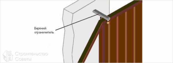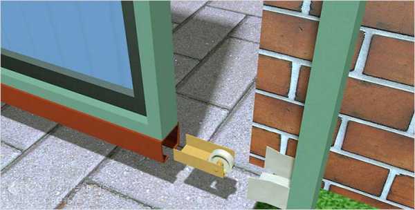 Предназначение нижнего уловителя — частичное снятие нагрузки с роликовых тележек при закрытом положении ворот; верхний уловитель держит закрытое полотно от раскачивания в период воздействия парусных нагрузок. Для определения положения нижнего уловителя полностью закрываем ворота и совмещаем его с концевым роликом. Верхний уловитель размещается так, чтобы в закрытом положении ворот его скобы касались защитных уголков.
