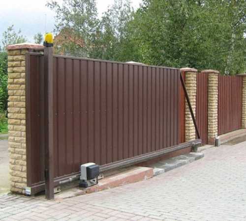 Последний этап для тех хозяев, которые желают, чтобы ворота открывались автоматически путем нажатия на одну кнопочку. Перемещаются откатные ворота в таком случае по зубчатым рейкам, которые можно найти в любом строительном магазине в комплекте с крепежными инструментами. Рейки устанавливаются на несущем профиле. Кроме реек, следует приобрести электропривод, лампу-маячок, пульт и ключ, установка которых проводится в соответствии с инструкциями и схемами, прилагаемыми к данному оборудованию.