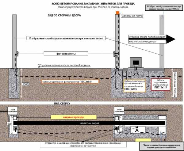 Если желаете установить автоматическое управление откатными воротами, необходимо заложить провода, спрятав их в гофрированные трубки. В зависимости от предполагаемого размещения электропривода, пучок проводов может выходить в любом месте фундамента; наиболее правильно это делать посередине.