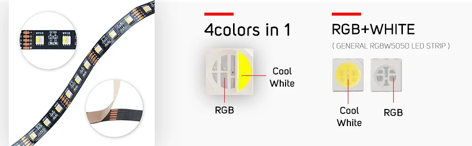 - , а также изменение цвета — либо RGB, либо RGBW (красный, зеленый, синий, белый), с использованием «три»/«четырех» чипов (три или четыре светодиодных чипа в одном).