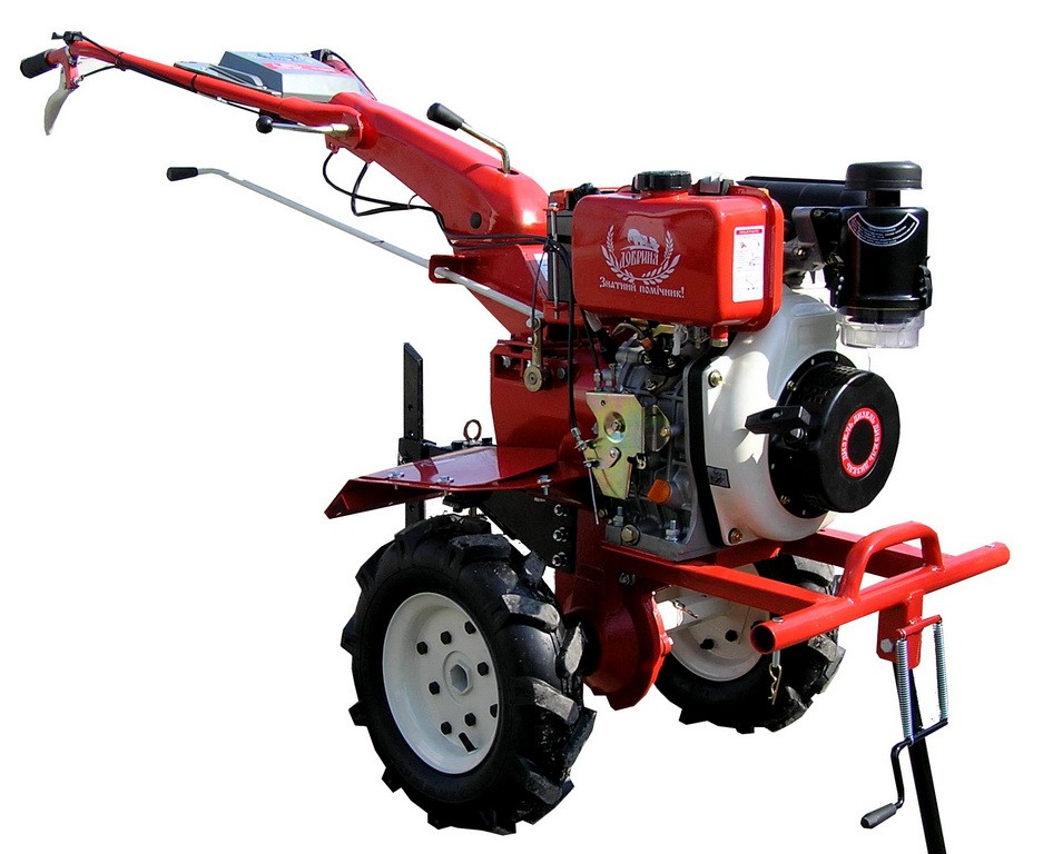мощностью 9,5 л. с. водяного охл. В стандартной комплектации — активная почвофреза и плуг.