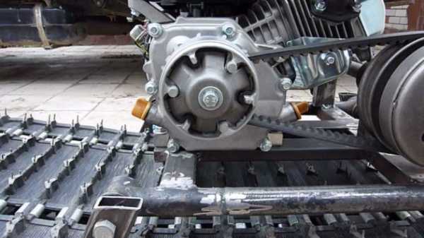 Для изготовления гусеницы может подойти транспортерная лента шириной не менее 22 см, которую желательно усилить металлическими шинами. Можно также взять гусеницу от снегохода «Буран», однако для расширения ходовой части ее придется разрезать пополам и сделать вставки. Гусеничные траки можно сделать из твердой древесины или снять 3 каретки вместе с катками с того же «Бурана» и тоже распилить их и соединить вставками. На мотор и четырехступенчатую коробку скоростей ставятся шкивы, соединенные с помощью ременной передачи.