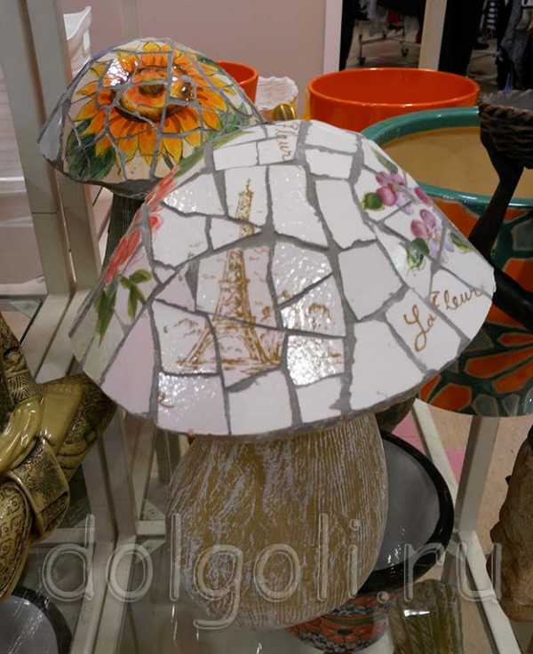Шляпки грибов тоже украшены блестящими осколками плитки с рисунком. Битые тарелки сюда тоже подойдут в качестве материала.