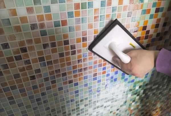 - По истечении одной — двух суток можно затирать швы. Начинать очищать мозаику следует не раньше чем через двадцать минут. Не рекомендуется использовать для этого слишком влажную губку, поскольку вода может повредить или смыть затирку.