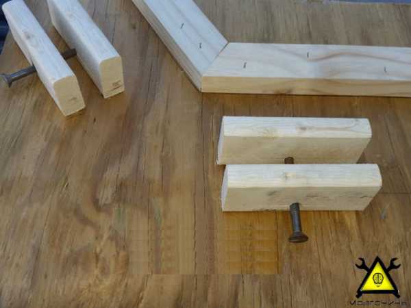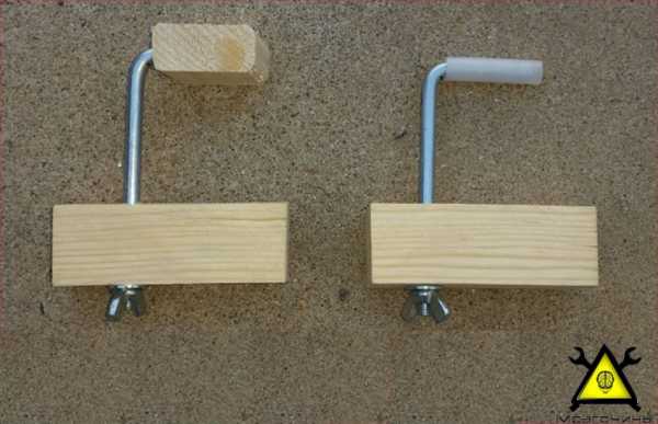 Отрезаем шляпки, зажимаем заготовки в тисках и загибаем под углом в 90 градусов при помощи трубы. После получения L-образных заготовок, сверлим отверстия в деревянных брусках. Проталкиваем обрезанные винты в отверстия, затянув их «барашками»