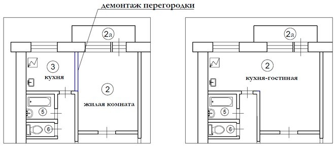 - Объединение кухни с комнатой, при условии размещения кухни в мокрой зоне.