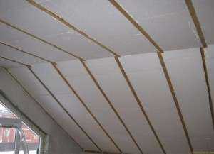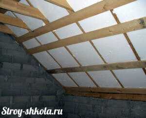 - Для этого поверх утеплителя из пенопласта крепят этот материал, который закроет стропила и не даст проникать холоду внутрь помещения.