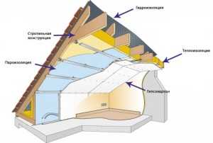 Как и в случае с минеральным утеплителем, при утеплении крыши пенопластом теплоизоляционный слой имеет форму многослойного «пирога», в котором обязательно присутствуют гидроизоляционная пленка со стороны кровли и пароизоляционная – со стороны помещения мансарды. Хоть пенопласт и не обладает способностью накапливать влагу, попадание воды и водяных паров внутрь слоя утеплителя крайне нежелательно – начинают гнить стропильные балки и другие деревянные элементы конструкции.