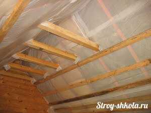 Для последующей отделки потолка можно установить натяжную или подвесную систему. Если вы планируете использовать гипсокартон или иные материалы, то перед этим потолок обшивается деревянным каркасом, рейки которого должны иметь толщину, превышающую толщину утеплителя.