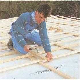 Он может быть обычным рубероидом или новыми материалами на основе вспененного полиэтилена. Процесс прикрепления к стропилам гидроизоляционной пленки или рубероида осуществляется строительным степлером. Но не следует забывать, что гидроизоляционный материал не надо натягивать, а наоборот, он должен слегка провисать.