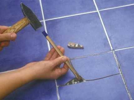 Если в результате простукивания плитки оказалось что под она плохо держится на основании, дефектную облицовку необходимо удалить. Используем для этого зубило и молоток