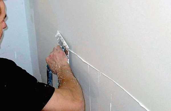 Если стены в комнате оштукатурены, их необходимо зашпаклевать гипсовой смесью. Это не только добавит им гидрофобности, но и придаст равномерный белый цвет.
