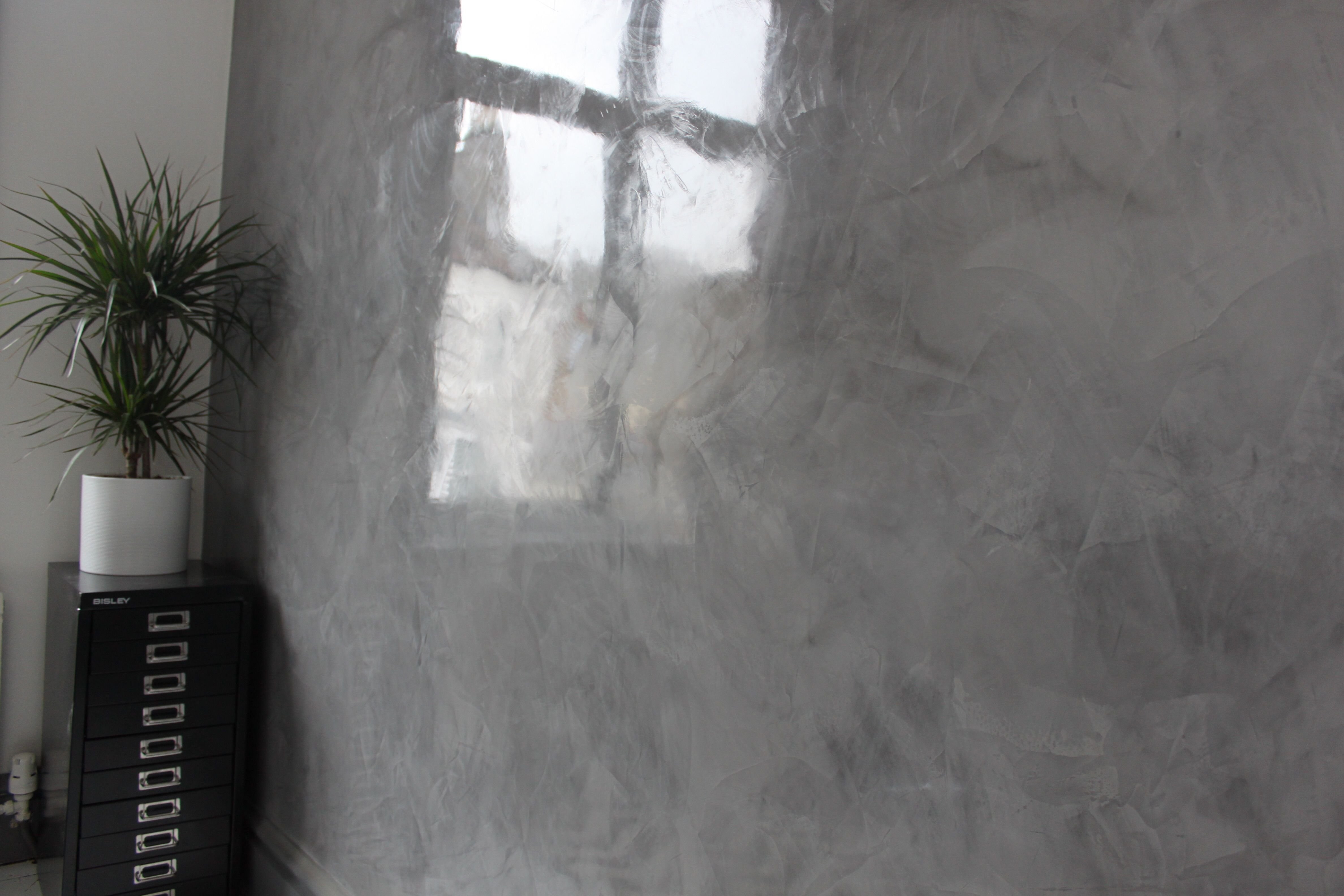 Выполняются они с определенным нажимом, шпателем важно двигать в разных направлениях. После обработки поверхность, созданная при помощи венецианской штукатурки, просушивается в течение недели, а потом на стену наносится воск очень тонким слоем. Именно он и обеспечит глянцевый эффект. После нанесения воска венецианскую штукатурку необходимо тщательно отполировать рукой, на которую предварительно будет надета замшевая варежка. Полировка производится круговыми плавными движениями, слегка нажимая на обрабатываемую площадь. Полученный результат хорошо виден на следующем фото.