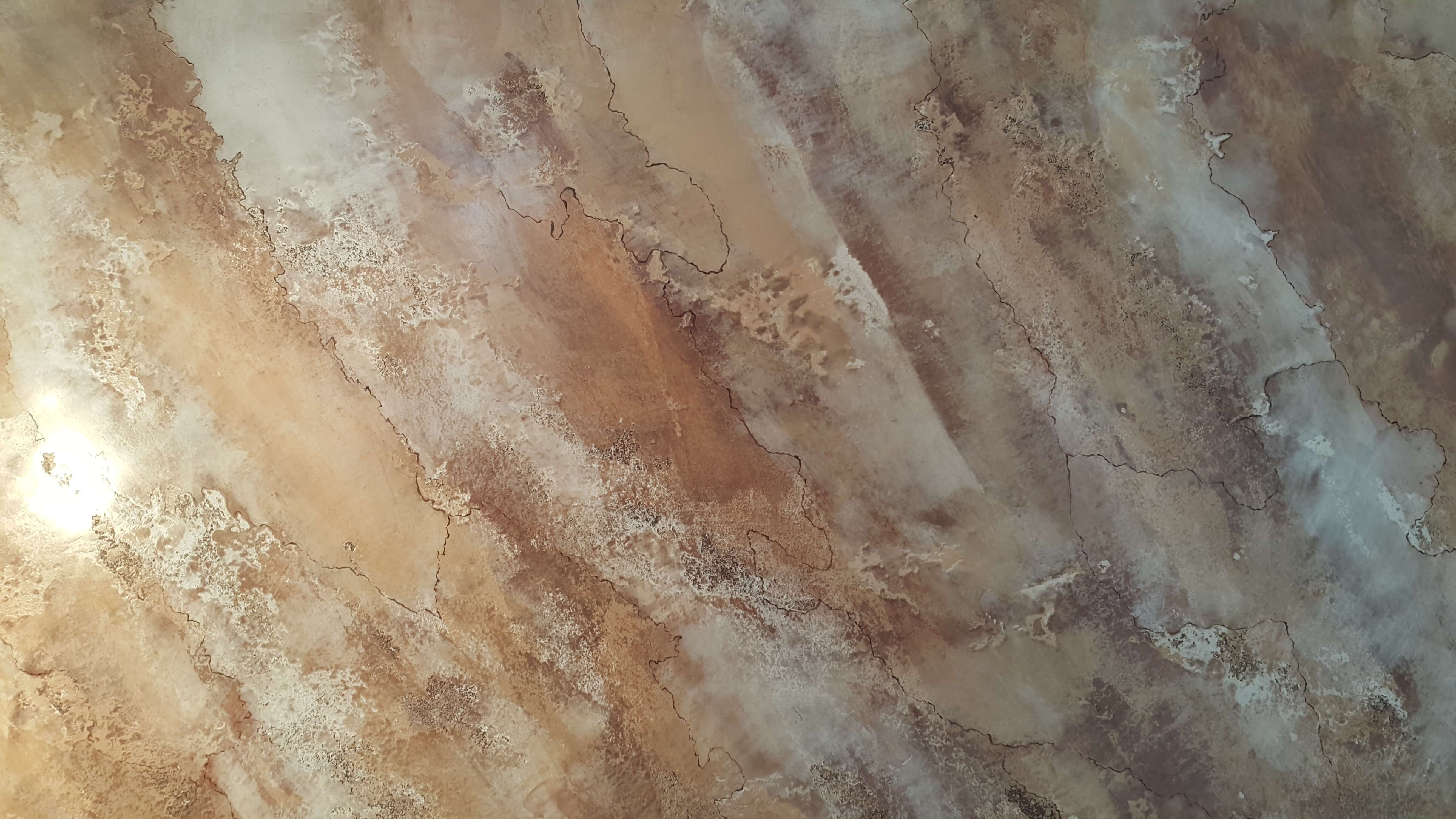 Можно с легким «недомесом», но «базовая доза» все-таки должна быть больше. Сформируйте третий слой. Наносите на высохшую базовую оштукатуренную поверхность, произвольно имитируя «мраморность» рисунка. Можно художественно усилить эффект камня на участках, где есть оттенок. Для этого тонкой кистью, окрашенной в контрастный базовому фону тон, «подрисовывают» имитацию прожилок.