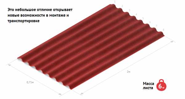 Лист имеет волнистую поверхность с высотой волны 3,6 см. Толщина материала – 2,7 мм, его длина и ширина – 2 метра на 0,95 метра. Вес одного листа – 6 килограмм.