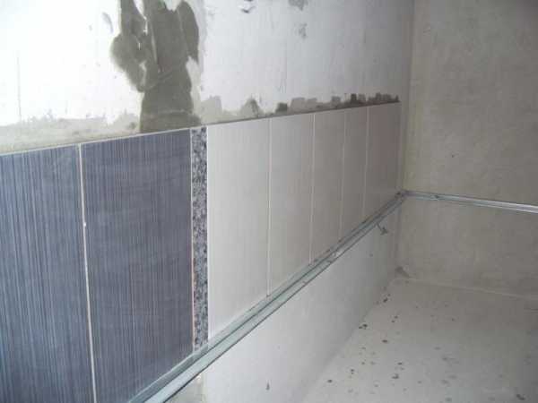 Кафель укладывают снизу вверх: вначале крепится нижний ряд, а выше – следующий. Опирать первый ряд на пол нельзя: он далеко не всегда бывает ровным. Под нижнюю сторону первого ряда следует уложить ровную деревянную рейку или металлический профиль для гипсокартонной системы. Стену вначале покрывают двухмиллиметровым слоем клеящей мастики, а на тыльную сторону кафеля после ее протирки влажной тряпкой – такой же слой мастики. После этого кафель прижимается к основе и осаживается деревянным бруском. Планку внизу не убирают до полного высыхания мастики под тремя нижними рядами.
