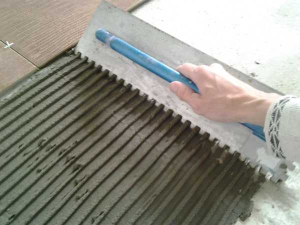 Клей с помощью зубчатого шпателя наносится не на кафель, а на отделочное основание.