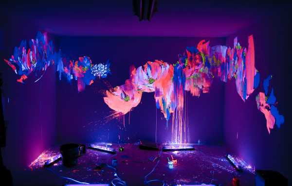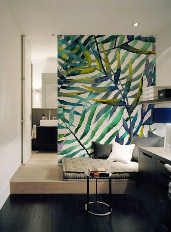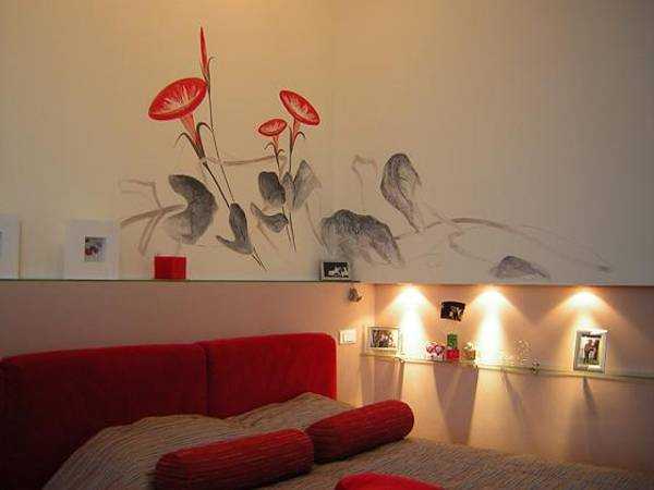 - Буйство цветов. Покрыв все стены помещения подобным образом, можно вызвать психологический дискомфорт. Однако при правильной расстановке мебели и умелом сочетании цветов такая роспись на одной из стен будет смотреться интересно.
