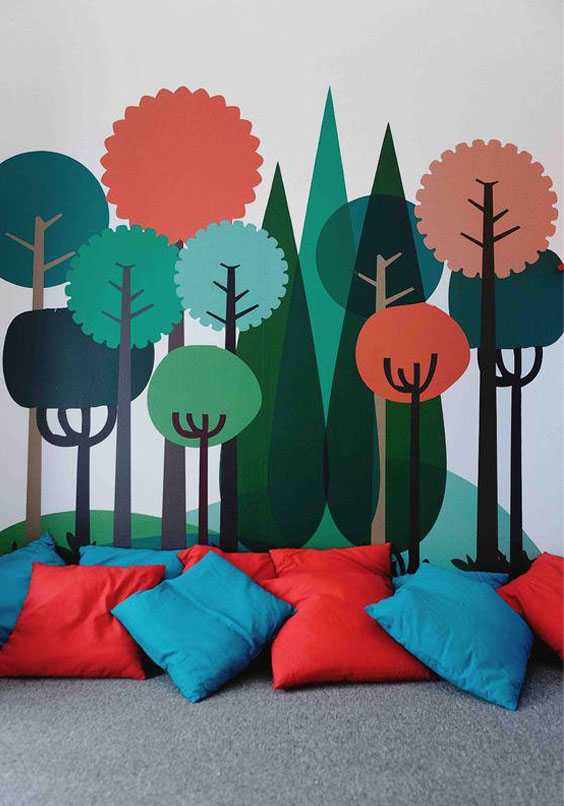 Стоит отдавать предпочтение спокойным и нейтральным цветам для настенного фона, а вот сами персонажи могут быть нарисованы в ярком и выразительном стиле.