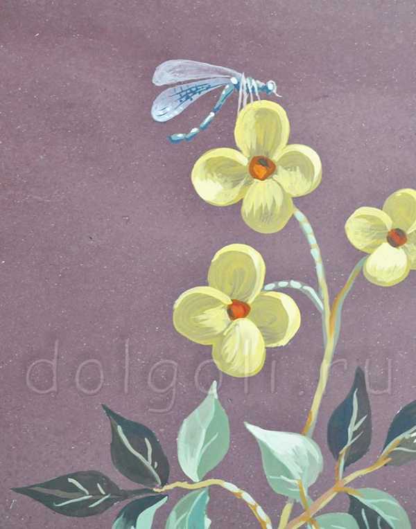 Листочки и лепестки сначала нарисовать одним цветом (так называемый «подмалевок»), а потом частично выделить свет и тень другим. Стрекоза нарисована несложно, но зато очень узнаваема, типичная поза хищного насекомого уловлена абсолютно точно.