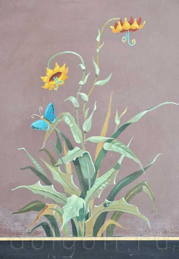Экзотические цветы-колокольчики с сидящей на листе бабочкой. Роспись не очень большая, не во всю стену, она занимает положение внизу стены, выше идут другие более мелкие рисунки и геометрические орнаменты.