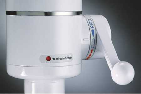 В среднем положении рычага вода не подаётся и питание отключено. При повороте влево из носика течёт холодная вода, напор которой можно регулировать. При повороте вправо включается ТЭН, что обозначается индикатором, и начинается нагрев. Максимальная степень его наступает в течение 3-5 секунд. Регулировать температуру воды можно или с помощью отдельного терморегулятора на корпусе или просто поворотом рычага – при сильном напоре вода нагревается меньше.