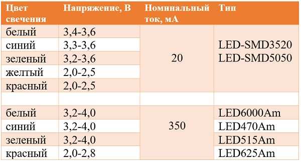 В то же время производители конкретных SMD светодиодов дают следующие напряжение питания светодиодов: