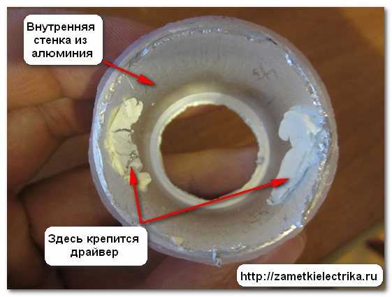 Через открывшееся отверстие виден драйвер, который крепится с помощью силикона к корпусу лампы. Но извлечь его можно только со стороны рассеивателя.