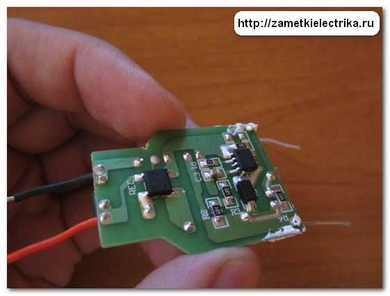Самые простые схемы выполняются на резисторе, который ограничивает ток светодиода. В этом случае нужно лишь правильно выбрать сопротивление резистора. Такие схемы питания чаще всего встречаются в выключателях со светодиодной подсветкой. Это фото я взял из статьи, в которой рассказывал о причинах мигания энергосберегающих ламп.
